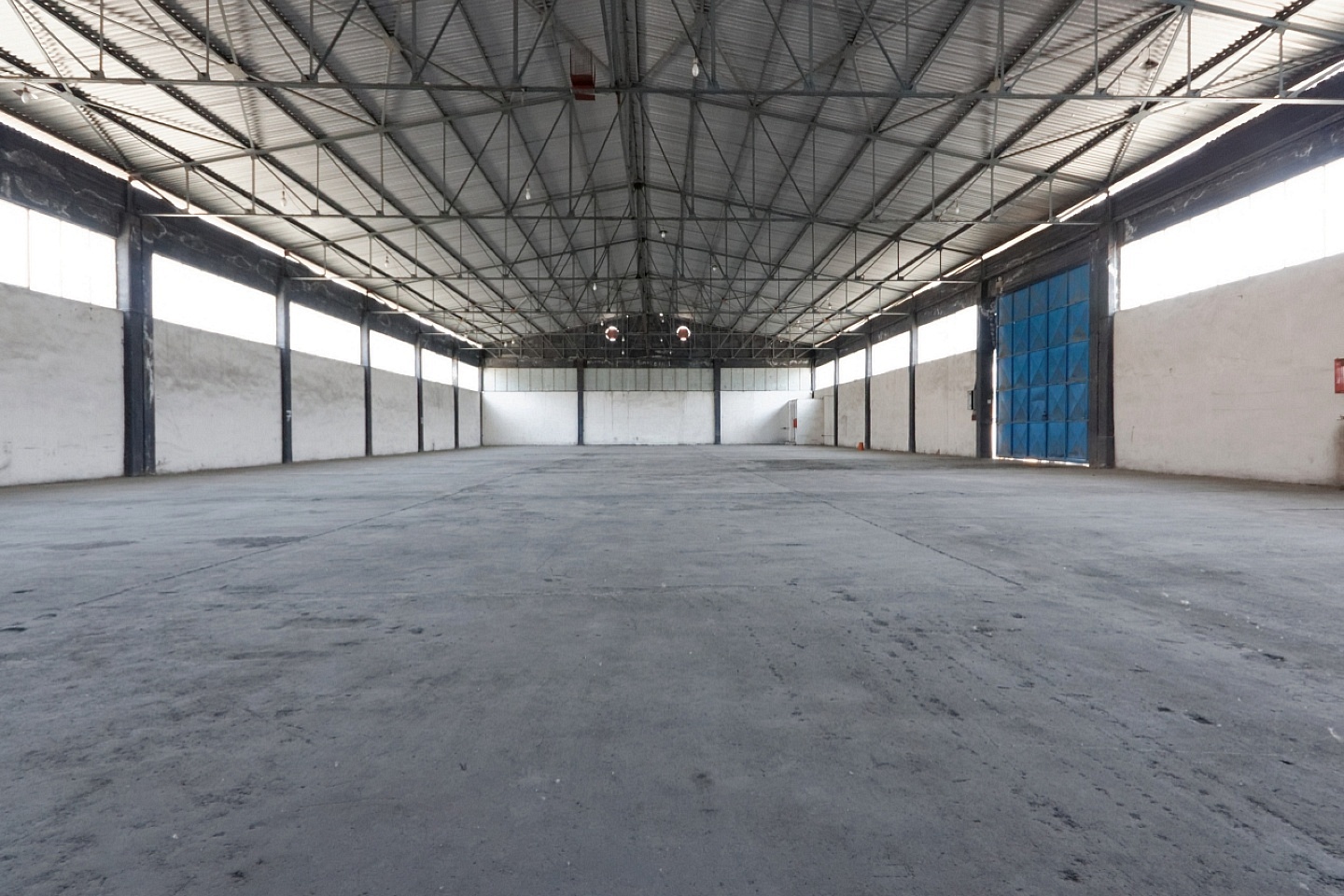 The warehouse comprises an open-plan ground space with good dimensions of 21.5x67 meters and a net height of 5.5 meters. It features a loading door, 2 toilets and a small office space of about 100 square meters.