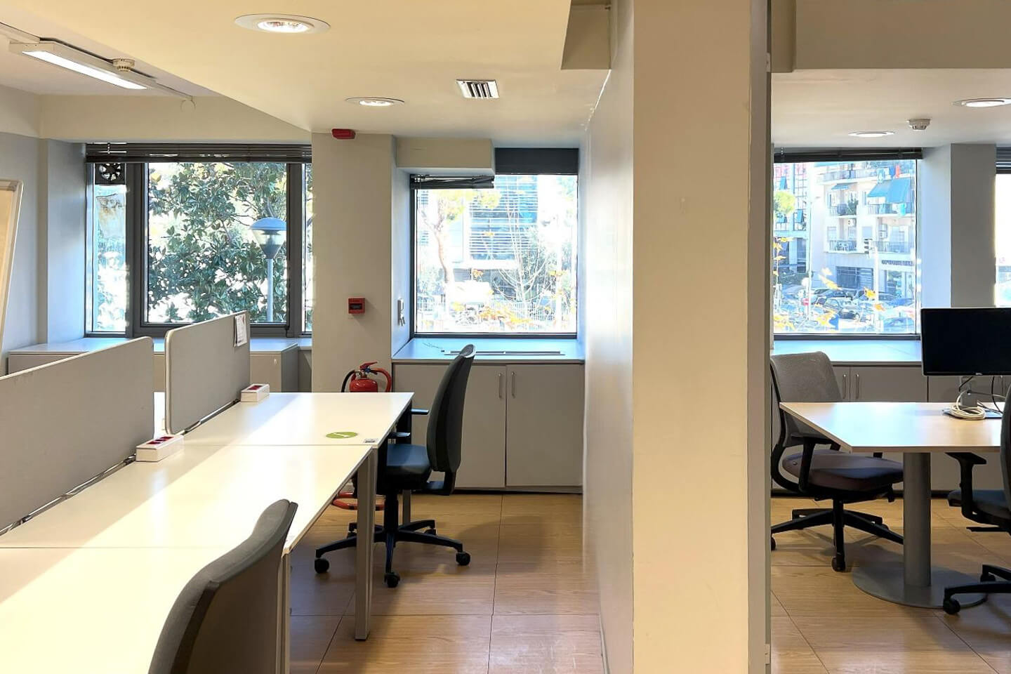 They consist of reception, open space offices, meeting rooms, booth, kitchen inside the floor and 6WCs. There is also a mineral fiber false ceiling, led lighting with motion sensors and raised vinyl floors.
