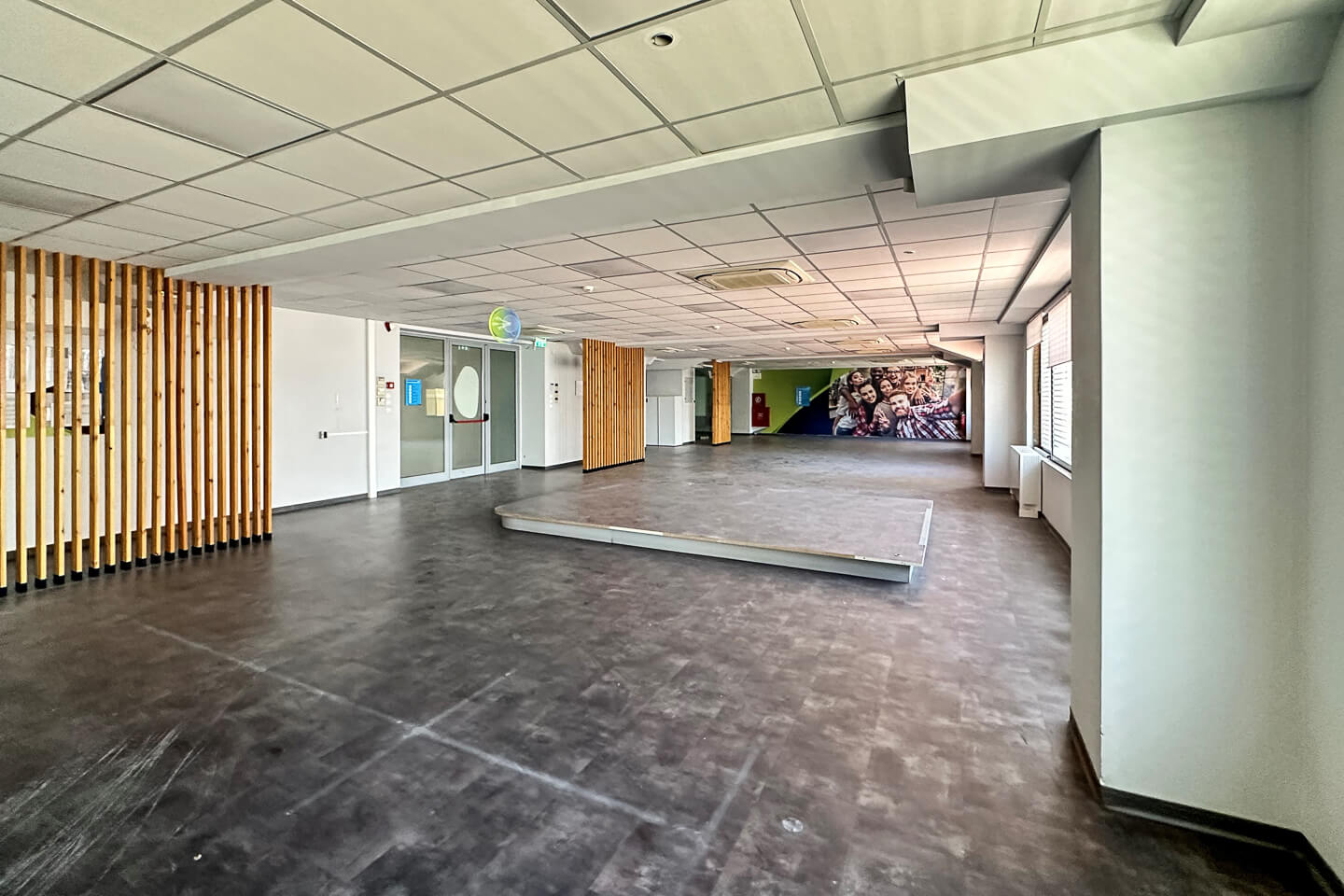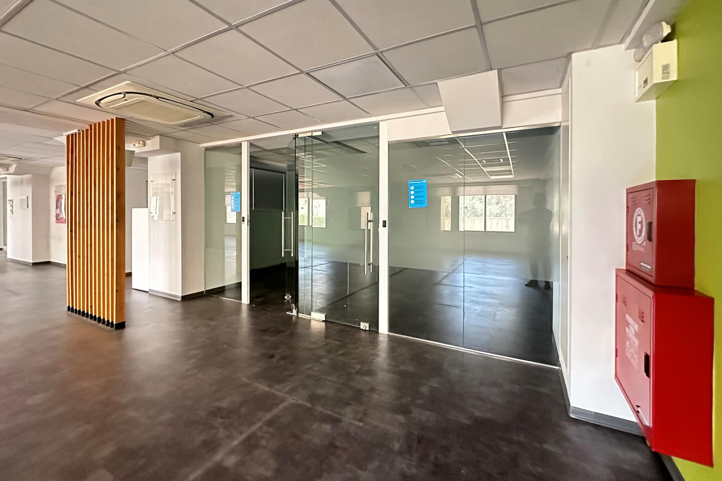 These are very bright open space areas that also include meeting room and a management office, kitchenette and wc. The offices have mineral fiber suspended ceilings and vinyl floors.