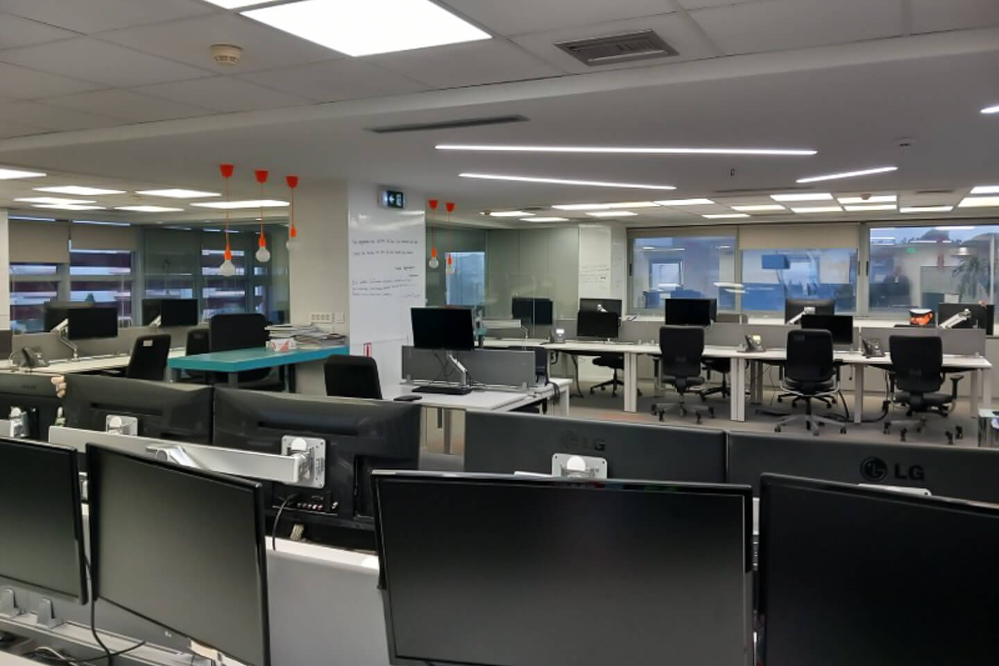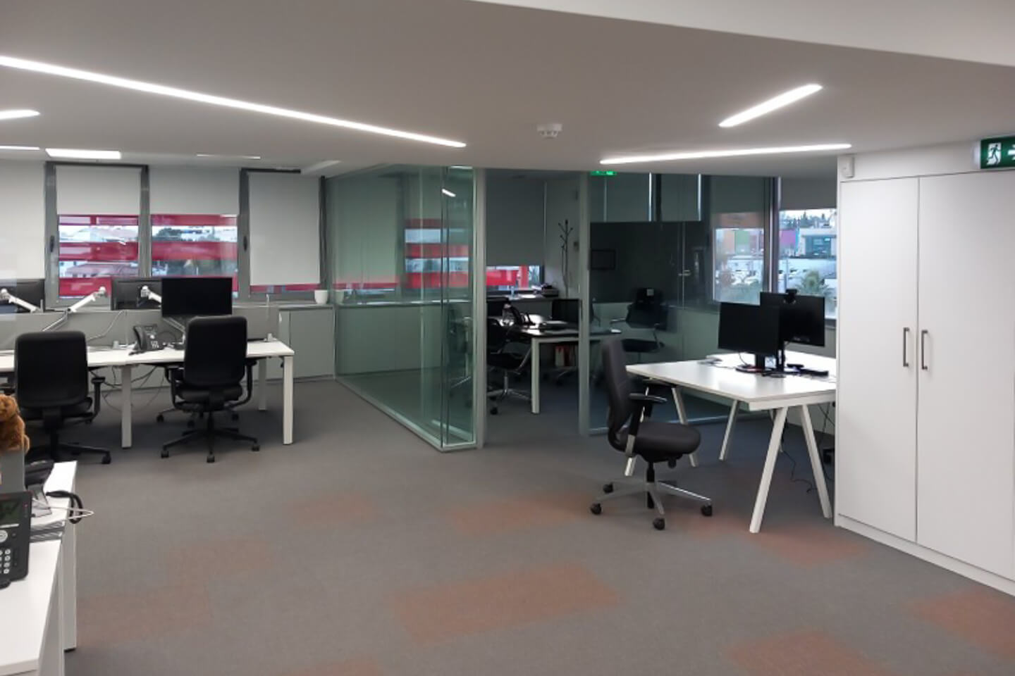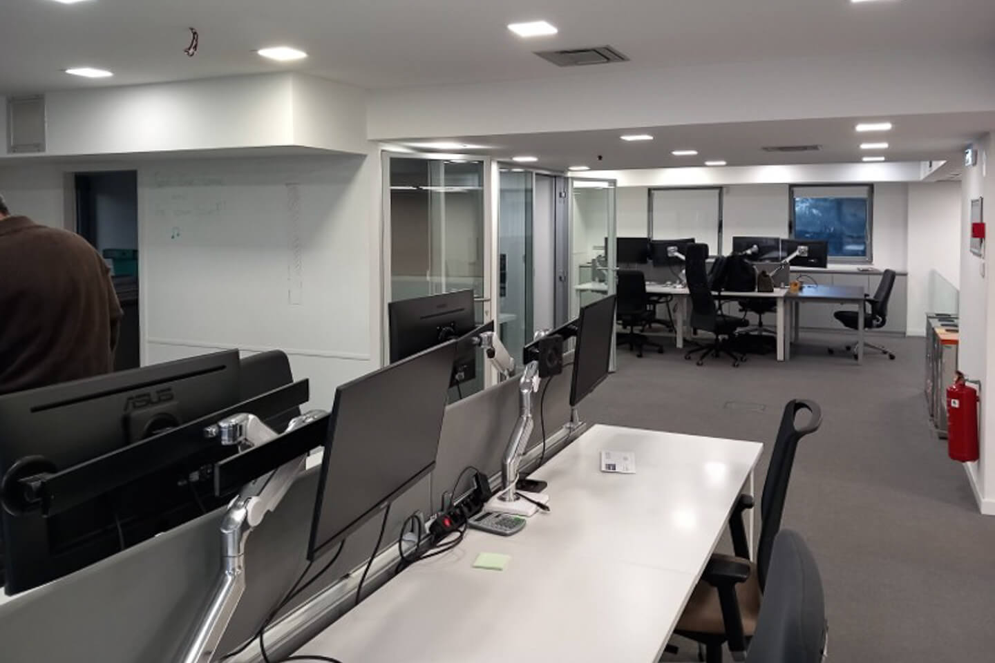 It has a reception, bright open plan workspaces with mobile glass partitions, meeting room, kitchenette and wc on each floor. The false ceilings are mineral fiber and plasterboard while the floors are carpeted. It also includes 19 parking spaces.