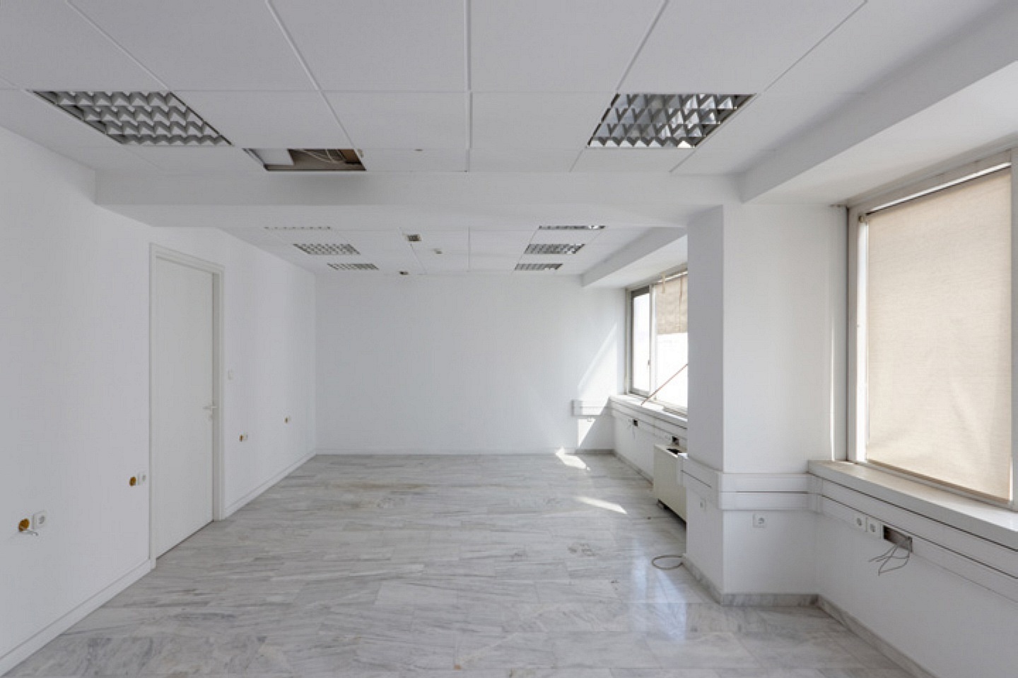 More specifically, the offices have bright open space areas, reception, meeting rooms, kitchenette and WC on each floor. The false ceiling is mineral fiber and the floors are tiled.