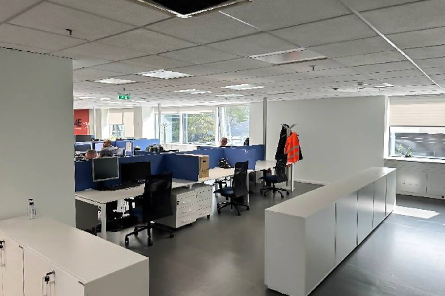 The office features bright open-plan areas with minimal movable partitions, a meeting room, computer room, reception area, kitchenette, and WC. It has mineral fiber suspended ceilings and laminate flooring.