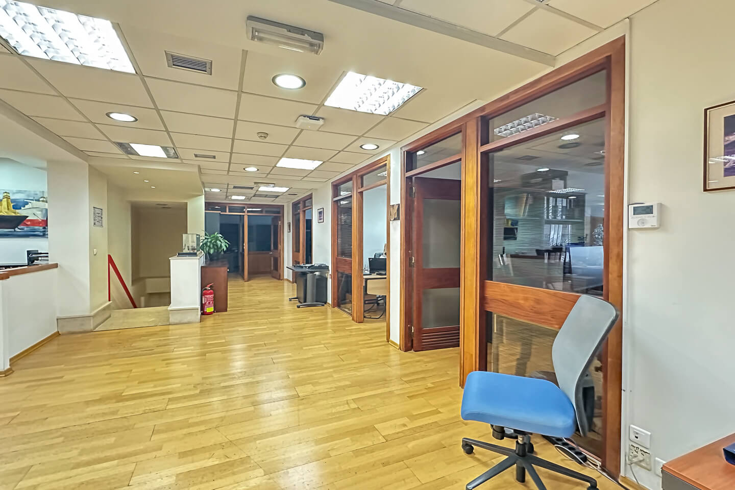 In more detail, the property consists of a reception, meeting room, server room, bright open space work areas with mobile glass partitions, closed offices, storage room, kitchenette and wc. The false ceilings are mineral fiber and the floors are laminate and wood.