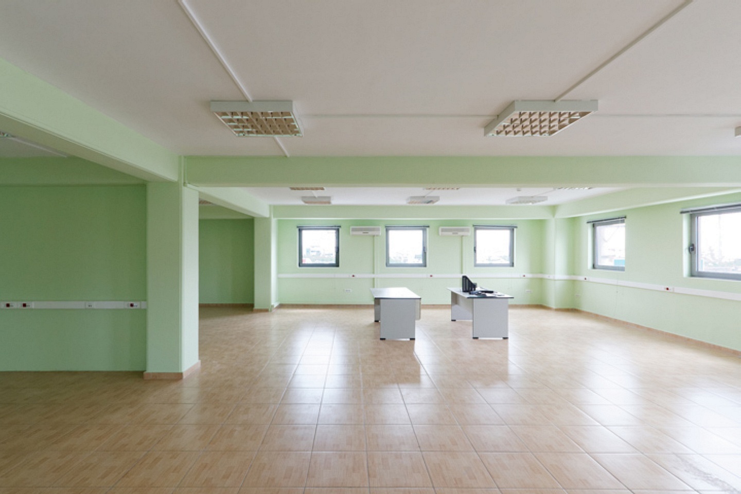 Offices have been constructed with all modern technical requirements such as structured cabling, autonomous cooling-heating, double glass panels, kitchenette, and WC on every floor. The spaces are in very good condition and offer an elevator and parking spaces.