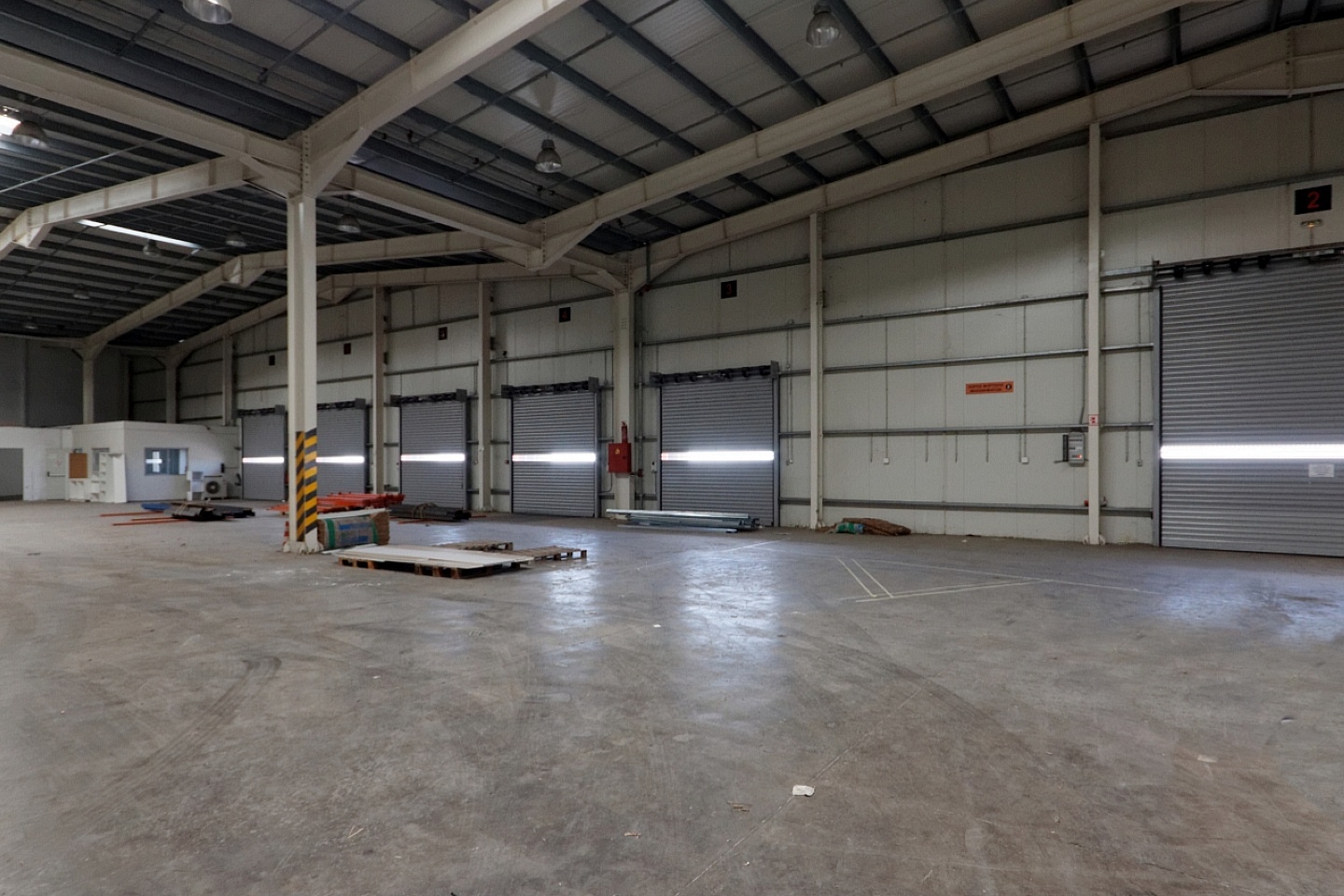 The warehouse consists of a ground floor space with 9.5 meters in height and 500 square meters of office space. It features all modern technical requirements such as industrial flooring, 6 loading ramps, 1 drive-in, a fire extinguishing system, and natural lighting.