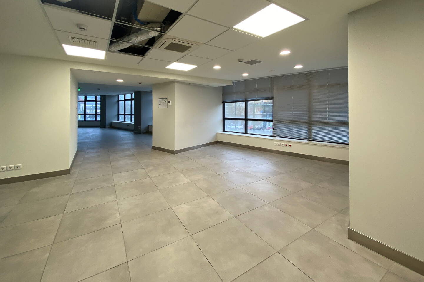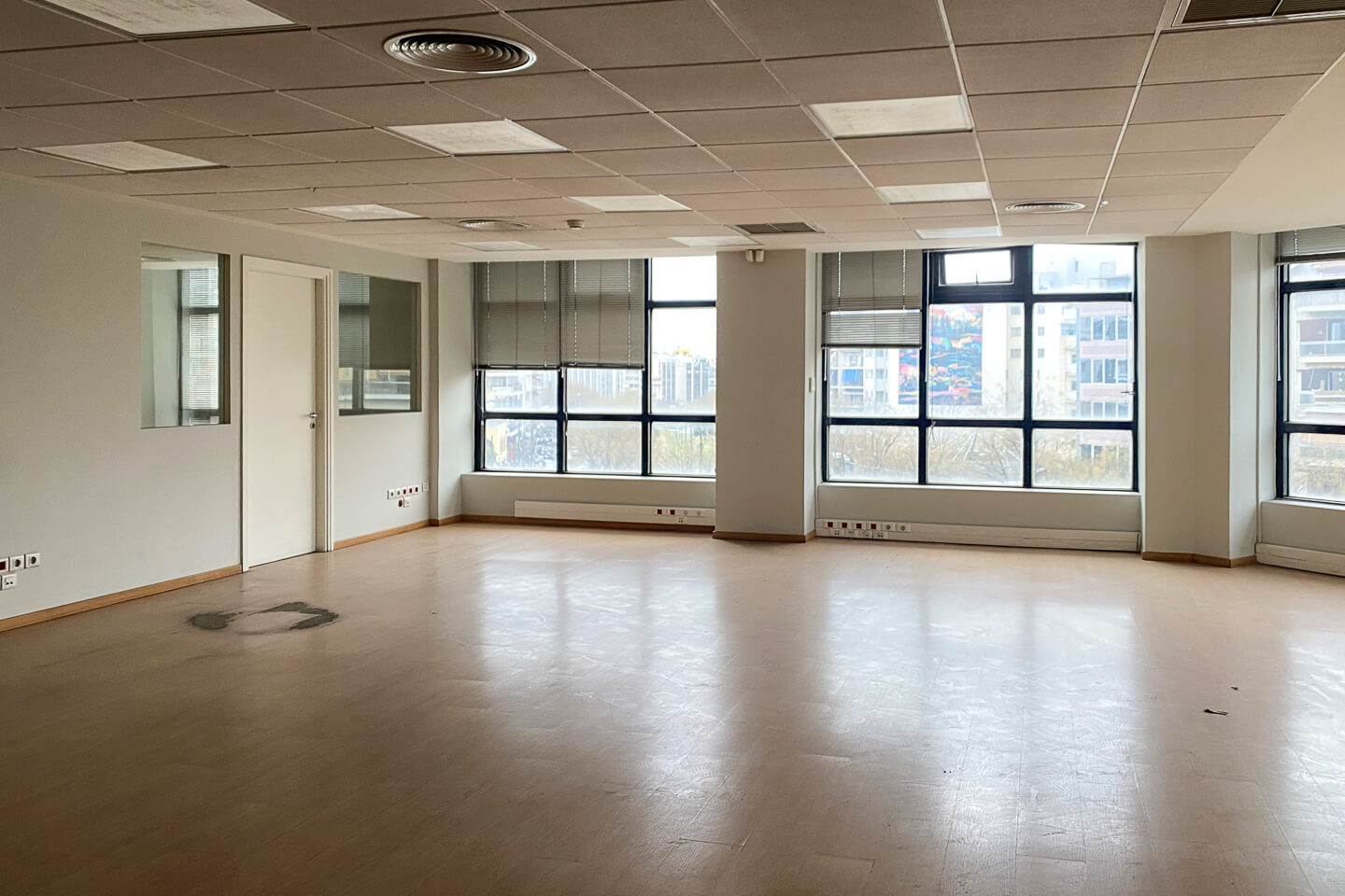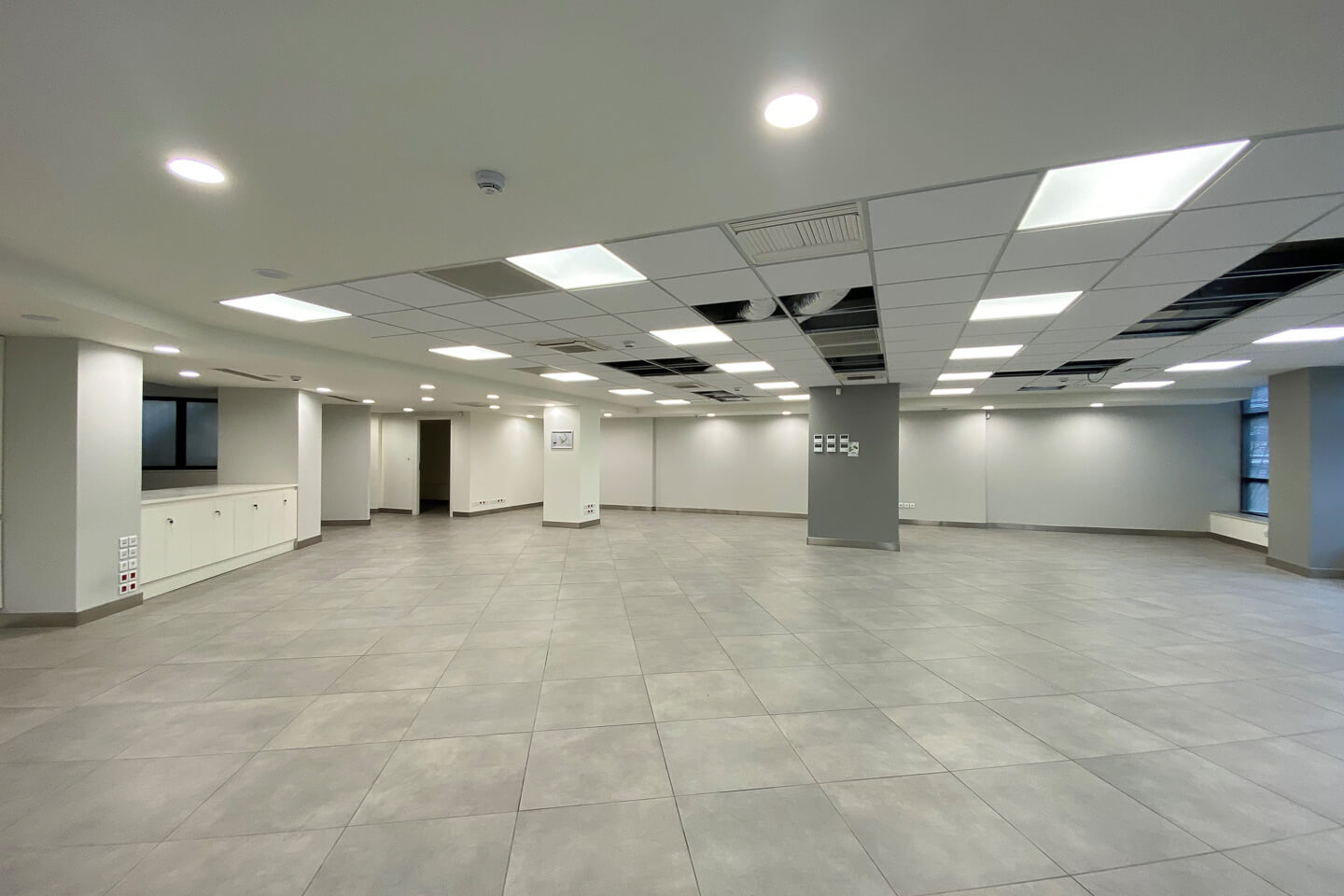 The interiors are open-plan and bright, featuring LED lighting, movable gypsum and glass partitions, kitchenette, and WC. Ceilings are fitted with mineral fiber panels, and the floors are finished with laminate.