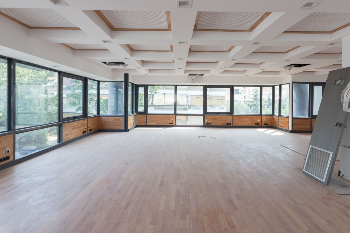 It consists of open space cabinets, a kitchenette, 2 WCs on each floor, 20 parking spaces with built-in wiring, an autonomous air-conditioning cooling system with a VRV system on each floor, water pump, laminate flooring for people elevator, disabled ramp, etc.