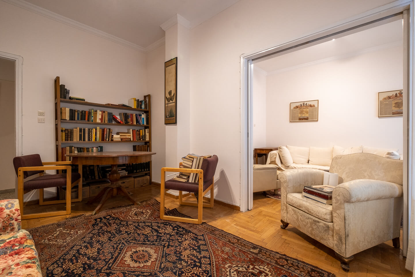 More specifically, it consists of 2 bedrooms, hall, dining room, living room, bathroom and kitchen. It has central heating, new air conditioning, elevator, balcony in the bedroom, library, sofas, carpets, curtains and very nice entrance.