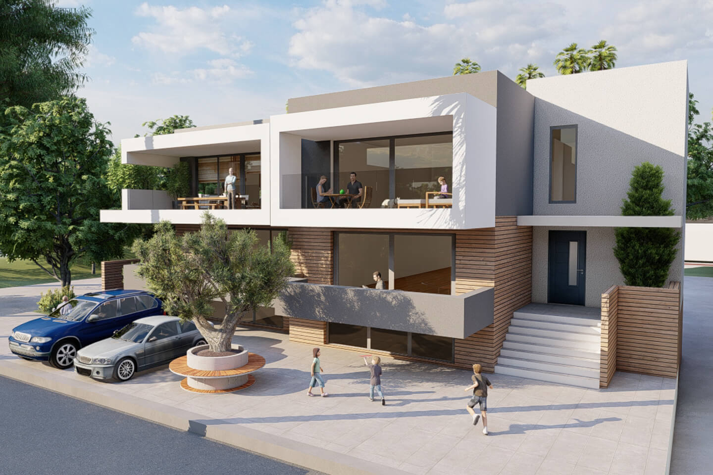 This property is at the base of the frame, regarding the building process, and has 3 levels which consist of the elevated ground floor, basement, and first floor, with a total area of 574 sq.m., consisting of independent apartments. The area of balconies and semi-outdoor spaces extends to 130.69 sq.m.