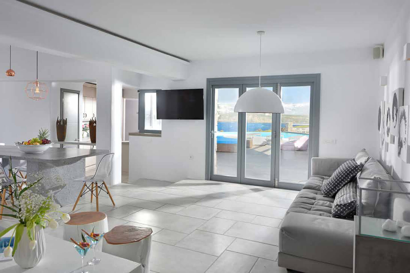 This luxury villa, built on a stunning seaside location in Mykonos, is very close to all the cosmopolitan destinations of the island, as well as to enchanting blue beaches.