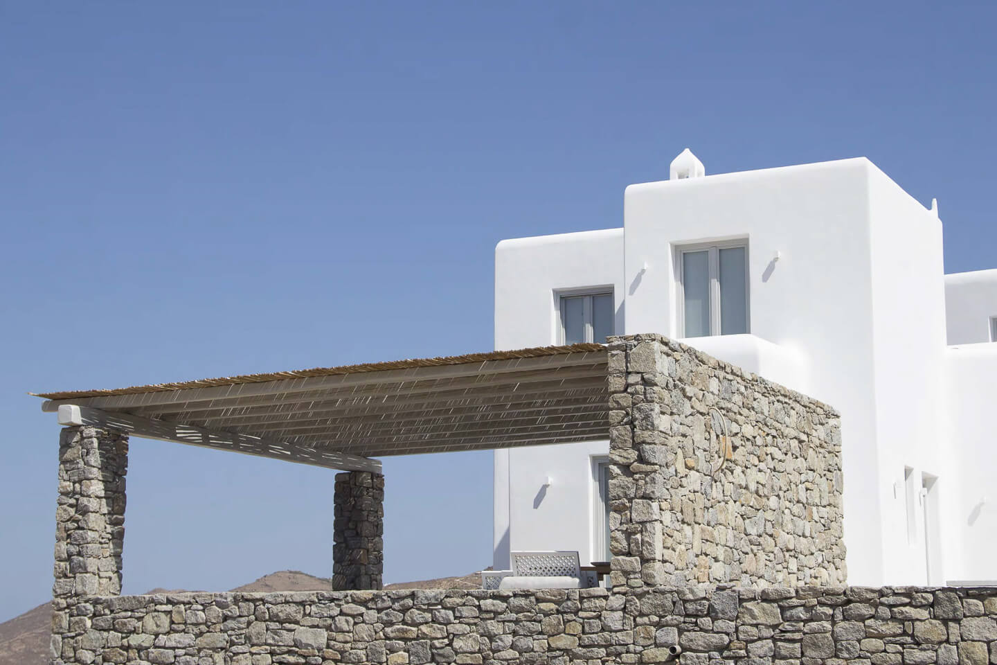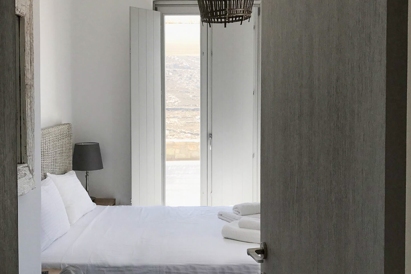 The two imposing villas are structured with clear bohemian elements of Mykonian architecture. Entering the first residence, you will find a spacious minimal living room with a traditional fireplace, a fully equipped kitchen with a dining area, and a guest WC, while on the second floor you will find the bedrooms area with en suite bathrooms and a large balcony for relaxation in front of the endless blue of the Aegean Sea.