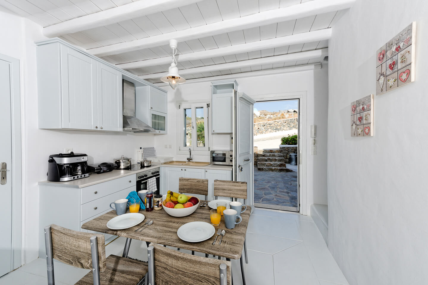 In just 2 kilometers from the blue waters of Kalafatis Beach and 10 kilometers from Mykonos Town, known as Chora in Greek, this modern villa of a total surface of 160 sq.m., is built on Cycladic architecture lines, offers a unique experience of accommodation at the most famous cosmopolitan island.