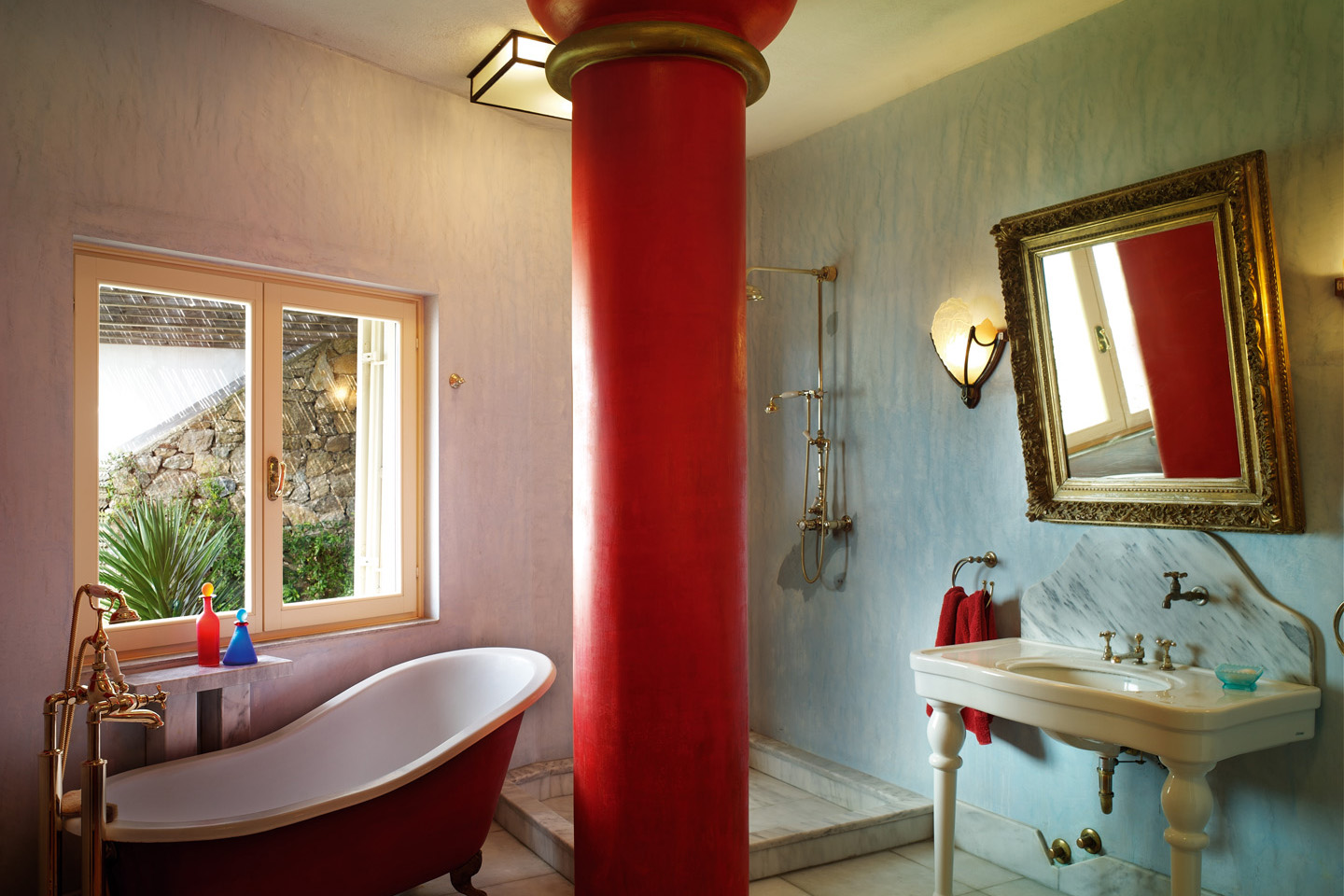 On the upper level of the main house, an entry hall opens to a large, living/dining room with a high barrel-vaulted ceiling. A special feature of this room is a floor-to-ceiling fireplace with a hearth of white Naxos marble. A separate, French-style, sitting room is decorated in blue and white with many windows which create the impression of being on a yacht. The very private master suite includes a large bedroom, a walk-in dressing room, a small study and a stylish bathroom. A spacious modern kitchen opens directly to an outside dining area.