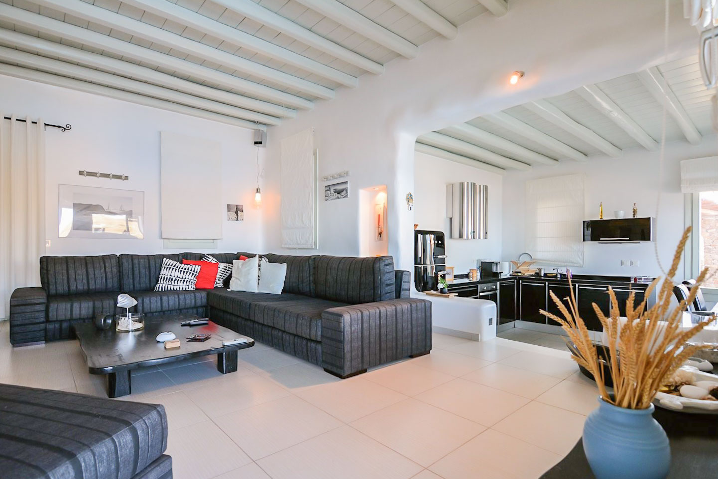 The villa is overflowed by the spellbinding view of the Aegean Ocean’s galactic blue and consists of elegant and sophisticated interior and exterior spaces that can facilitate either your personal relaxation moments or large parties. The villa’s accommodations comprise a deluxe main building of 136 square meters including a large living room with a fireplace and dining room, a fully equipped kitchen, a master bedroom with an en-suite bathroom, two additional bathrooms, and lofty ceilings. It is featured by the Cycladic architecture which, combined with, the simplicity of the majestic white and further natural pale shades creates a heavenly setting in the luminous blue backdrop and the sunset over the Delos island.