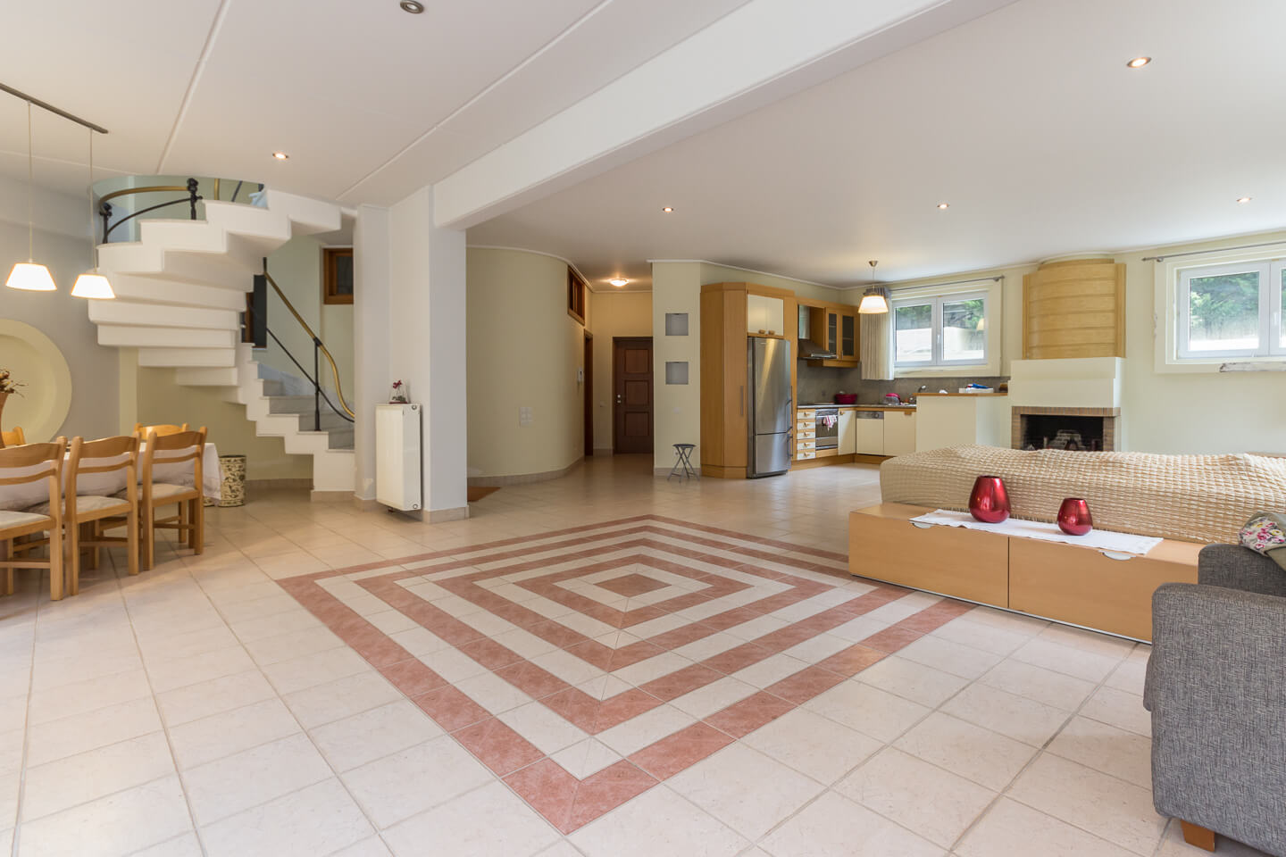 Specifically, by entering the ground floor we find an open planned area of the living room with a fireplace and a kitchen, 1 bedroom, 1 bathroom, and the boiler room.