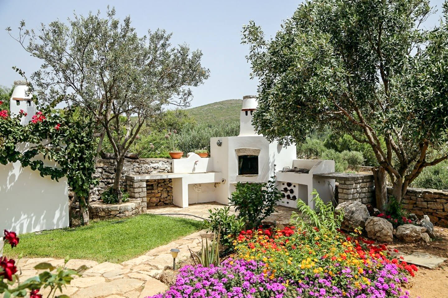On the outside, dominating the two stone-built wells of the residence, there is a dining room with a pergola to enjoy the panoramic view and the coolness that comes from the gorges on either side of the house. The outdoor space is completed by the kitchen, which is a separate stone building, as well as the traditional stone-built oven and BBQ.